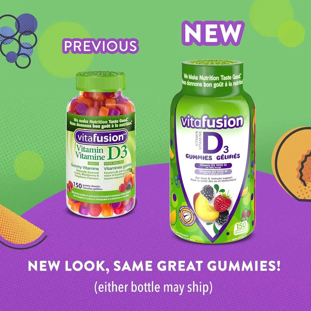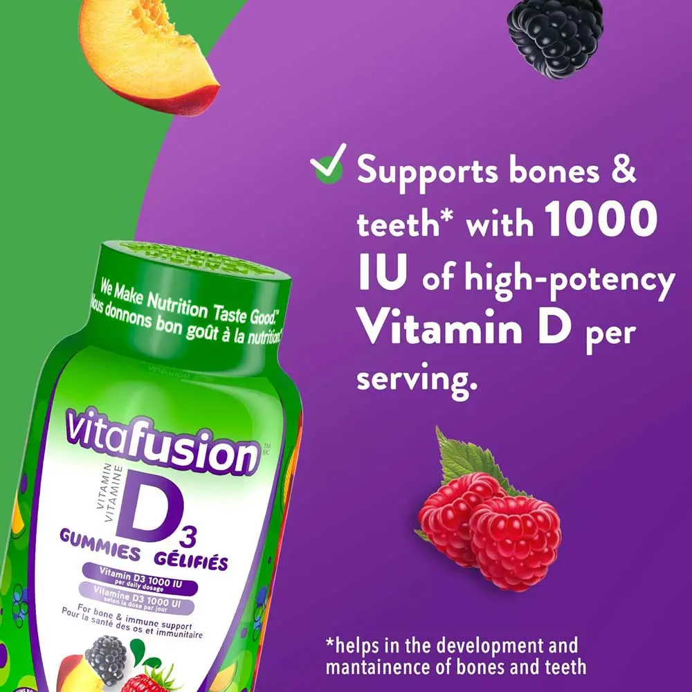 Tasty Vitafusion D3 Gummies with 1000 IU Vitamin D. Supports bones, teeth & immune health. 150 count, 5-month supply, naturally fruity flavors.